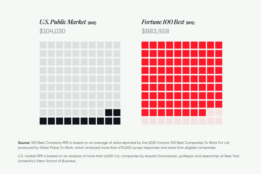 Companies on the Fortune 100 Best earned 8.5 times as much revenue per employee (RPE) as the U.S. market.